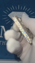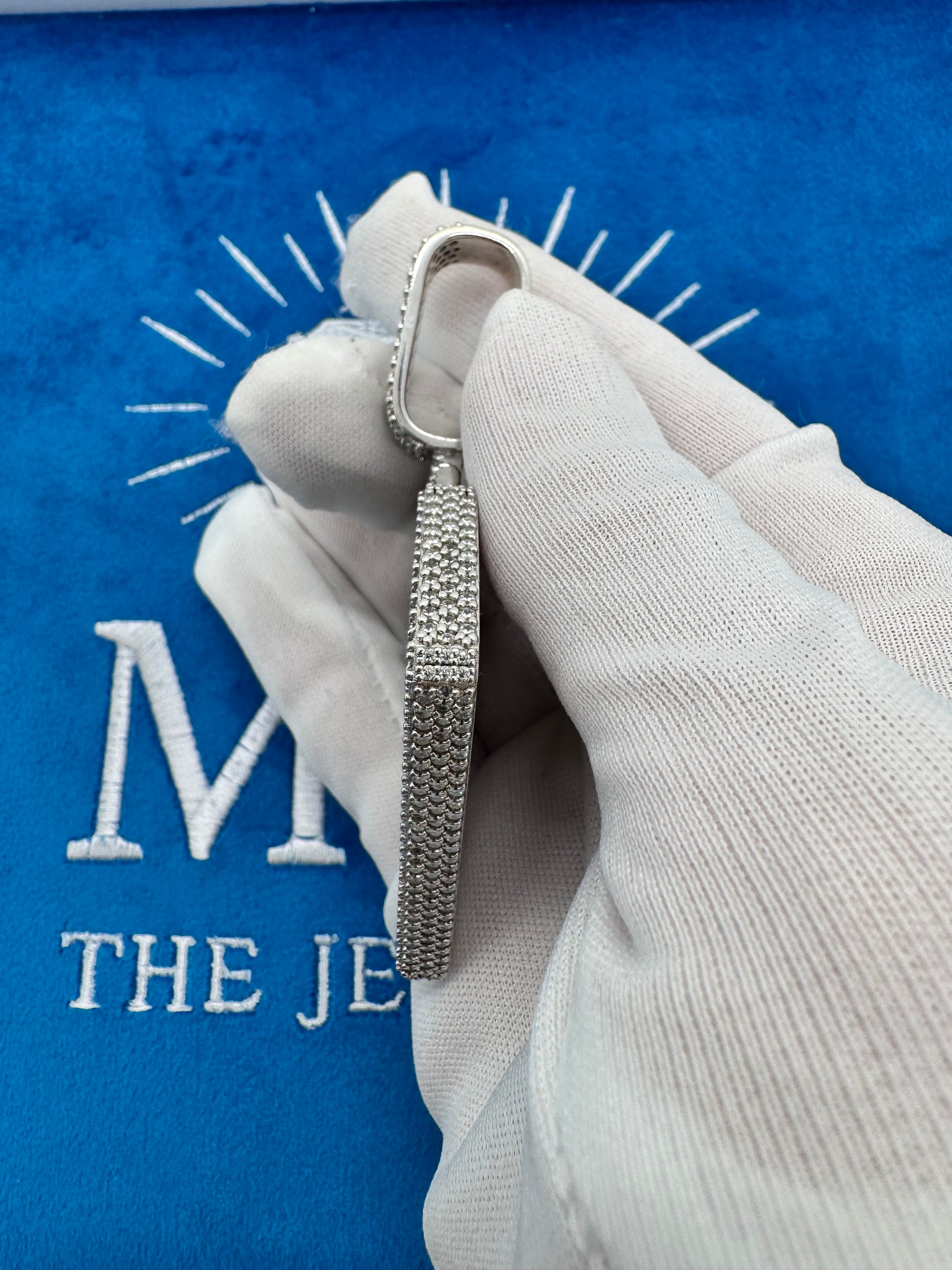 The pendant features VVS1 moissanite, known for its extreme sparkle, fire, and ability to pass diamond testers with ease. Every line of the diamond outline is sharply defined, giving the piece a luxury, high-end custom look. The oversized, pavé-iced bail completes the statement, making it perfect for thicker Cuban, rope, tennis, or box chains.