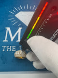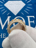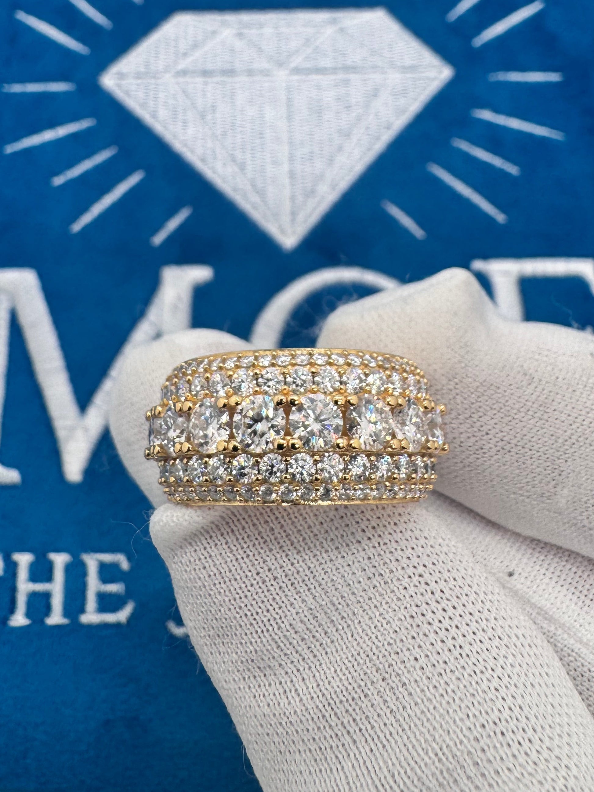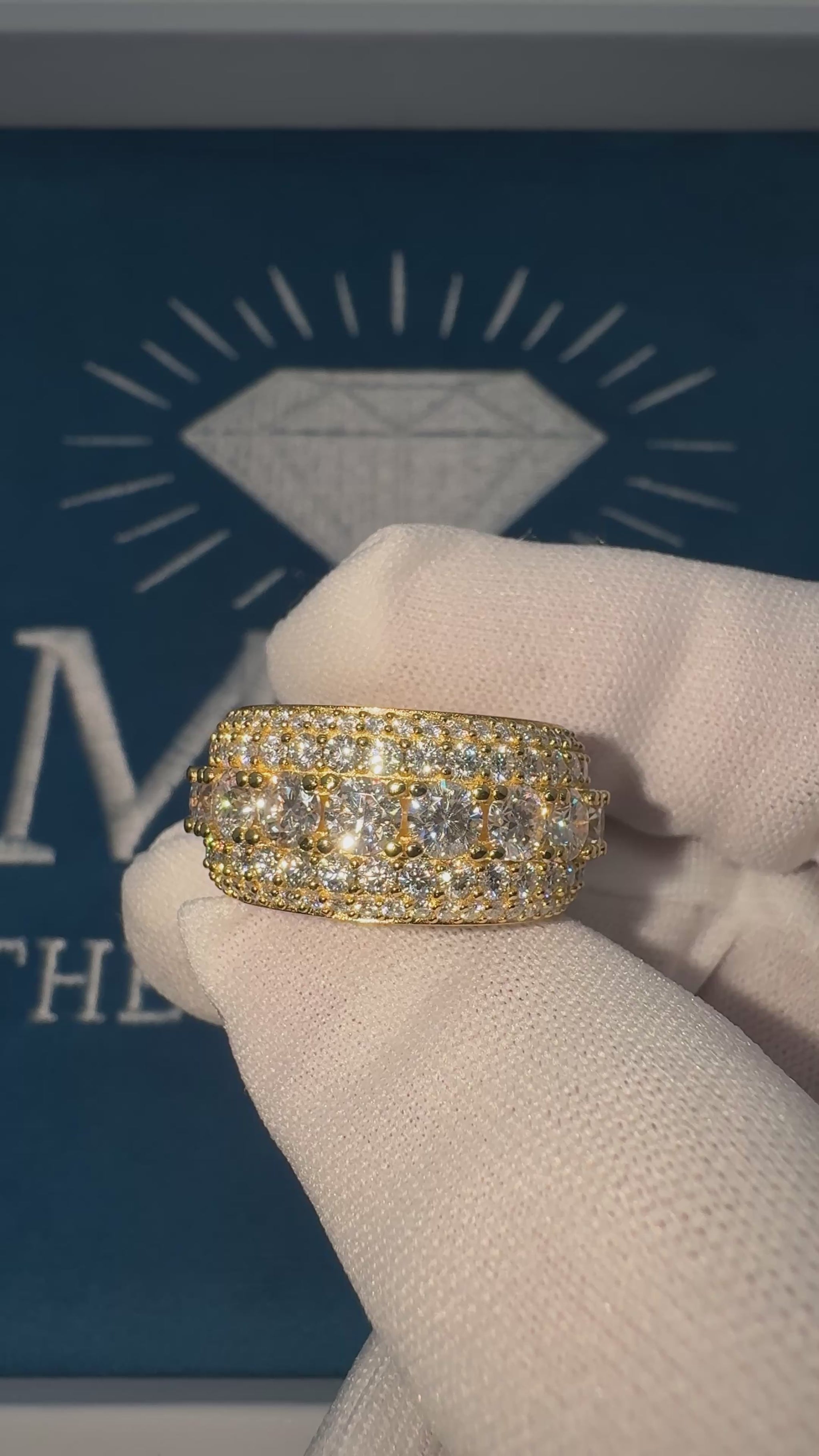 This VVS1 moissanite ring features a striking multi-row design, fully iced with perfectly matched stones that deliver nonstop fire and brilliance. The center row showcases larger round-cut moissanites, framed by pavé-set stones above and below for maximum sparkle and depth.